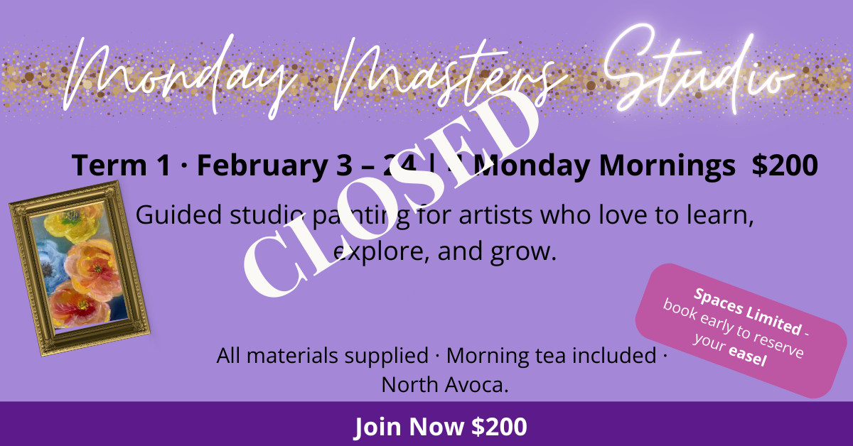 Each Monday morning, Cheryl welcomes a small group of dedicated painters into her light-filled studio. Easels are ready, brushes and boards are prepared, the still life is arranged under spot light. — You simply arrive and paint.